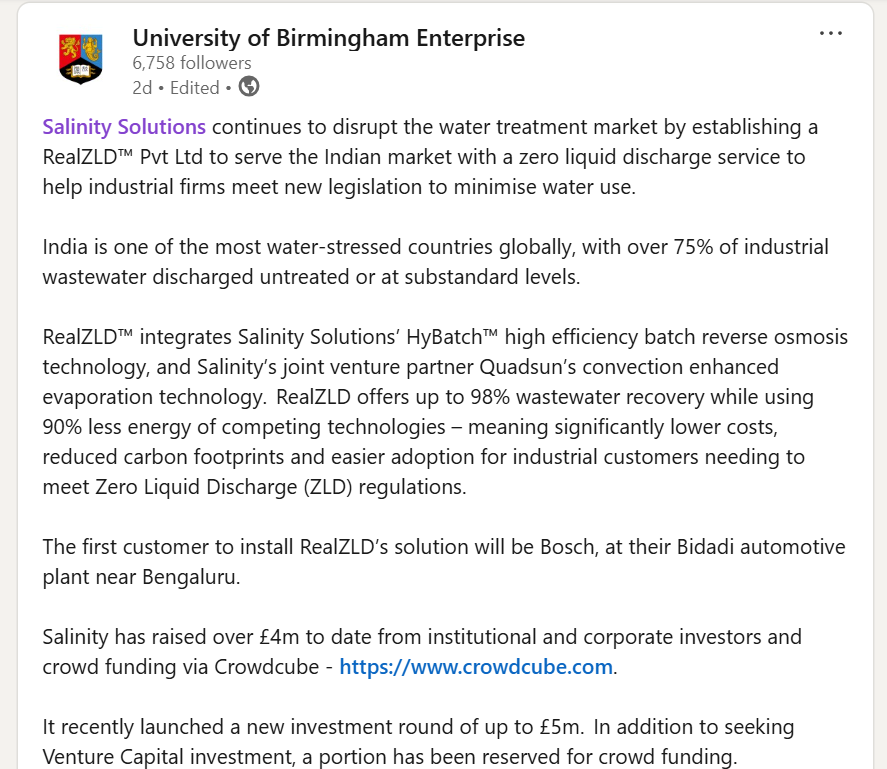 We are delighted to have reached the £600k milestone in our current capital raise campaign. Our sincere thanks go to Ruth Ashton and the University of Birmingham Enterprise team for their timely and supportive coverage in LinkedIn last week, and to everyone who has invested in and supported our mission to tackle the global water crisis with breakthrough technology.